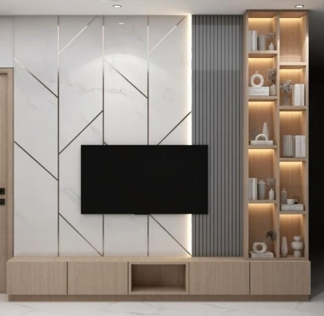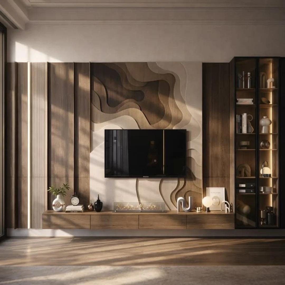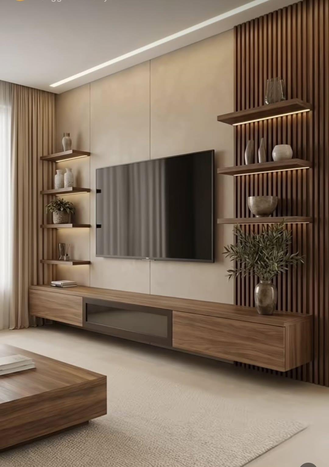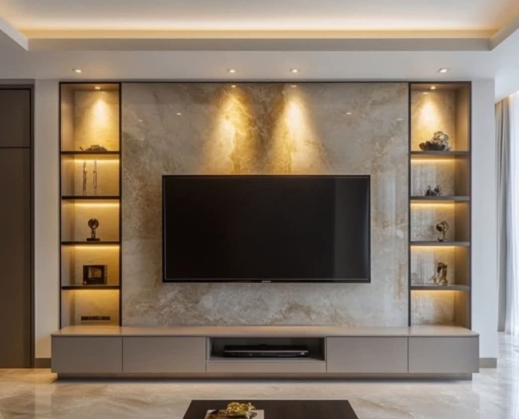 • Symmetrical Storage: Flanking the TV are open-shelf display units with recessed lighting, perfect for showcasing art, books, or collectibles.