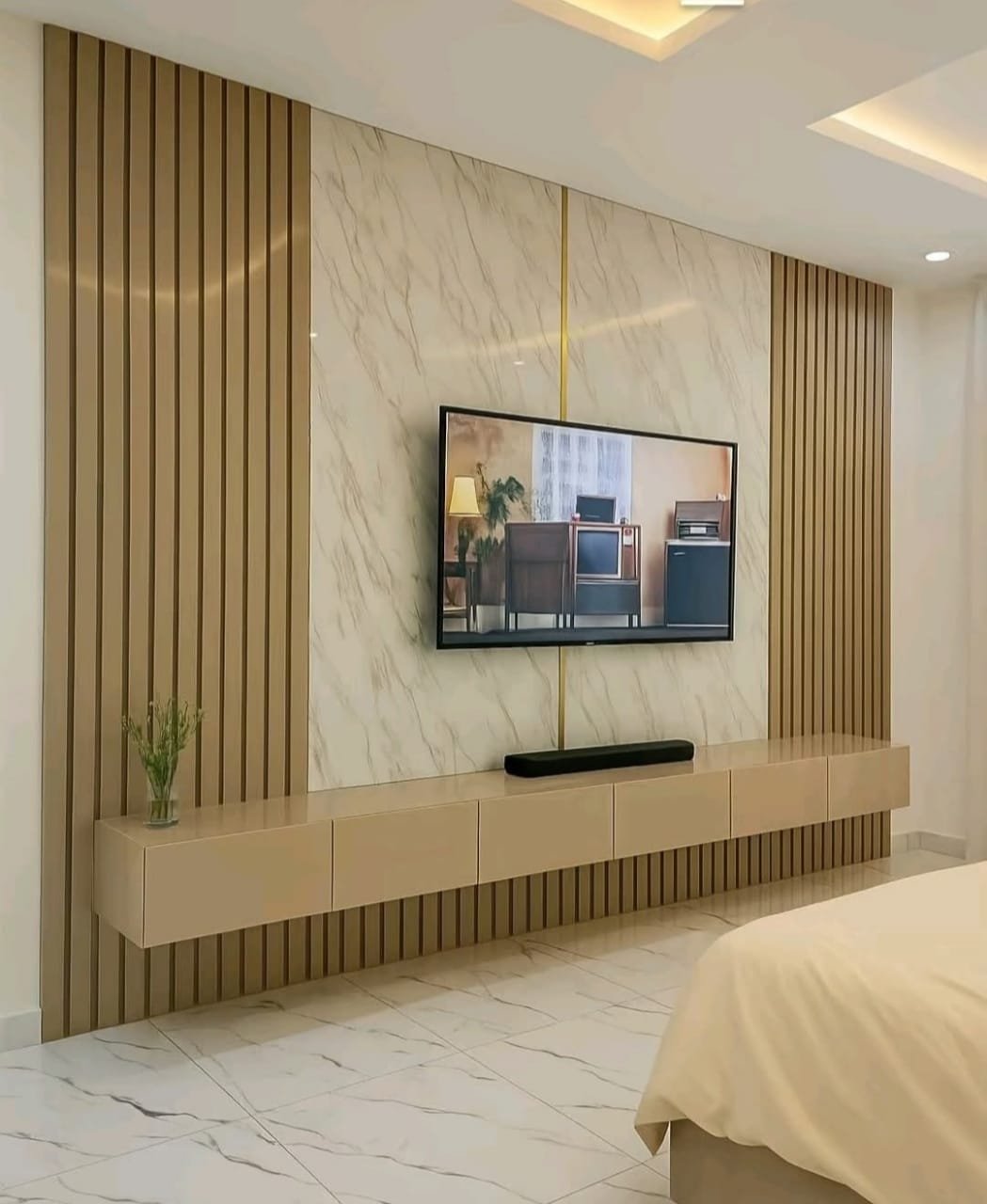 Transform your entertainment space into a sanctuary of style. This design features a centerpiece of white Calacatta marble-effect paneling accented by a striking gold vertical inlay. The surrounding natural oak fluted panels provide a rhythmic texture that adds depth and warmth to the room.